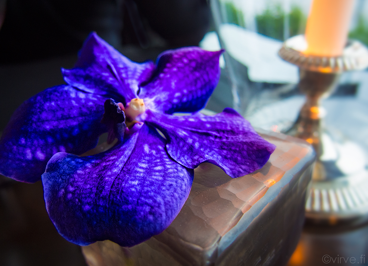 Ensivaikutelma paikasta oli arvokas, ei siis mikään pönötys-arvokas, vaan sellainen skandinaavisen tyylikkään arvokas. Meidät ohjattiin kauniisti katettuun, kynttilöin ja orkideankukin varustettuun ikkunapöytään. Ulkona viimoi jonkinsortin syysmyrsky, joten painelin ensitöikseni puuterihuoneeseen tarkistamaan olenko muuttunut mustasilmäiseksi pandaksi tahi onko nutturani saalistanut vaikka jonkun onnettoman yksilön sateenvarjon. (Kokemukseni mukaan kavaljeerini ei semmoisesta edes huomaisi huomauttaa..)